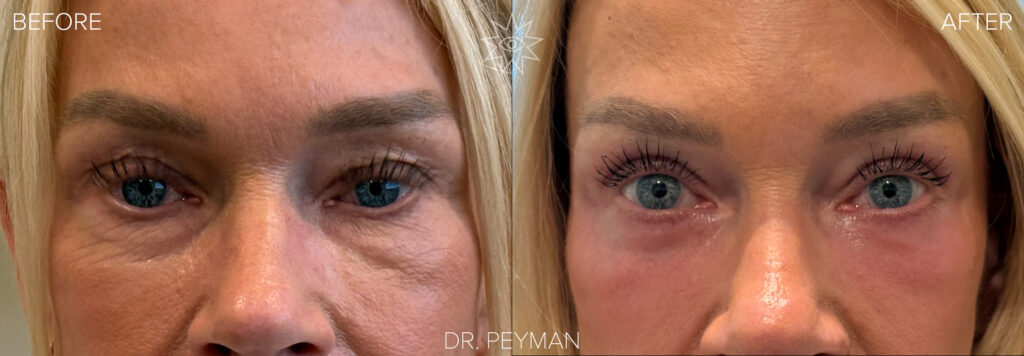 Before and after of a woman's full eye rejuvenation with quad blepharoplasty and laser resurfacing by Dr. Jason Sabet-Peyman in Orange County, showing a transformation to a balanced, youthful, and naturally refreshed appearance.