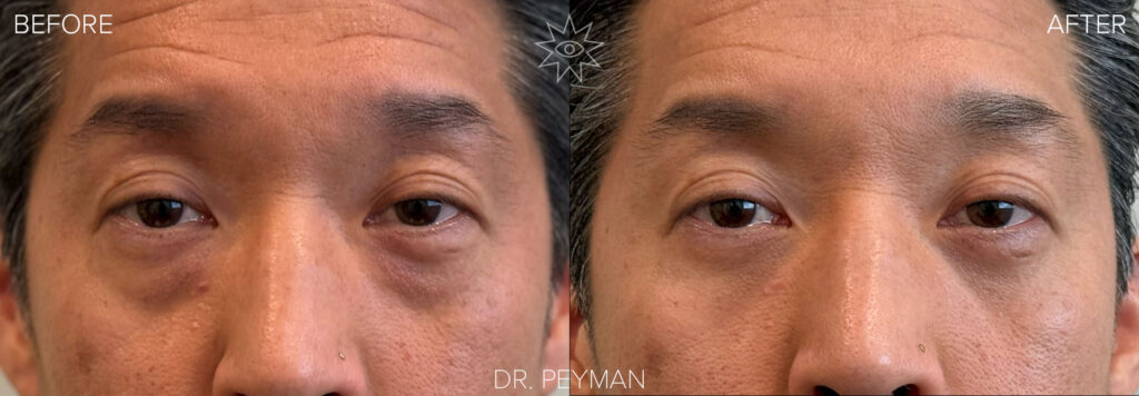 Before and after of a transconjunctival lower eyelid blepharoplasty with periocular laser by Dr. Sabet-Peyman in Orange County, showing a subtle but significant smoothing of the under-eye contour for a refreshed and natural result.