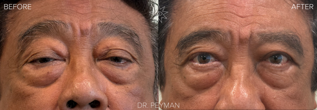 Dr. Sabet-Peyman performed a functional ptosis repair on both upper eyelids to tighten the eyelid muscles and lift the resting position of the lids. After surgery, his eyes are open, his vision is clear, and he can look straight ahead without lifting his head. Because his drooping lids were truly blocking his sight, this procedure qualified as medically necessary and was covered by insurance after proper visual field testing.